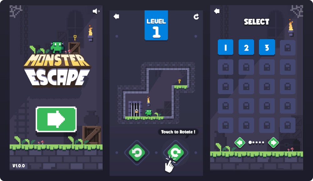 モンスターエスケープは、61レベル(ステージ)のパズルゲームです。鍵を手に入れてダンジョンから脱出することが目的です。トラップに不意打ちされることもあるので気を付けてください。